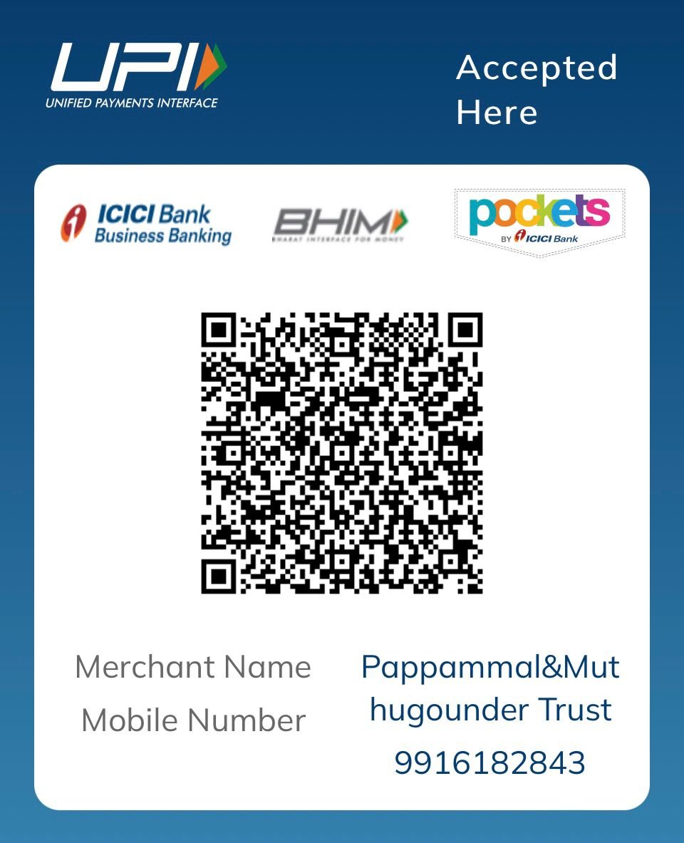 (2) direct bank transfer : ICICI Bank, PAPPAMMAL AND MUTHUGOUNDER TRUST,, Account Number:: 660901701688, IFSC: ICIC0006609